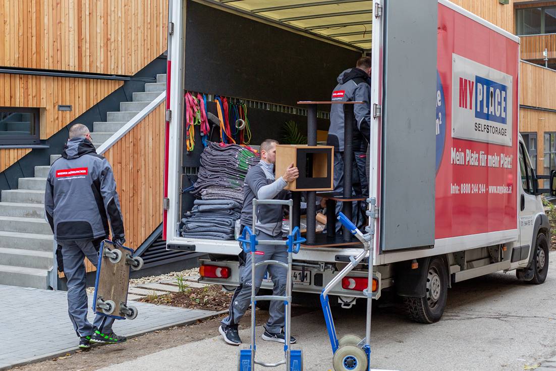 Wiener Möbelpacker tragen Schwerlast in einen Umzugstransporter